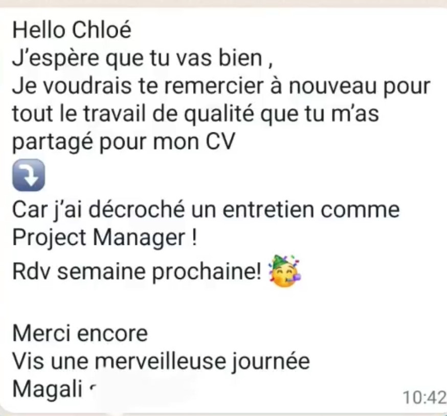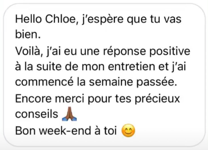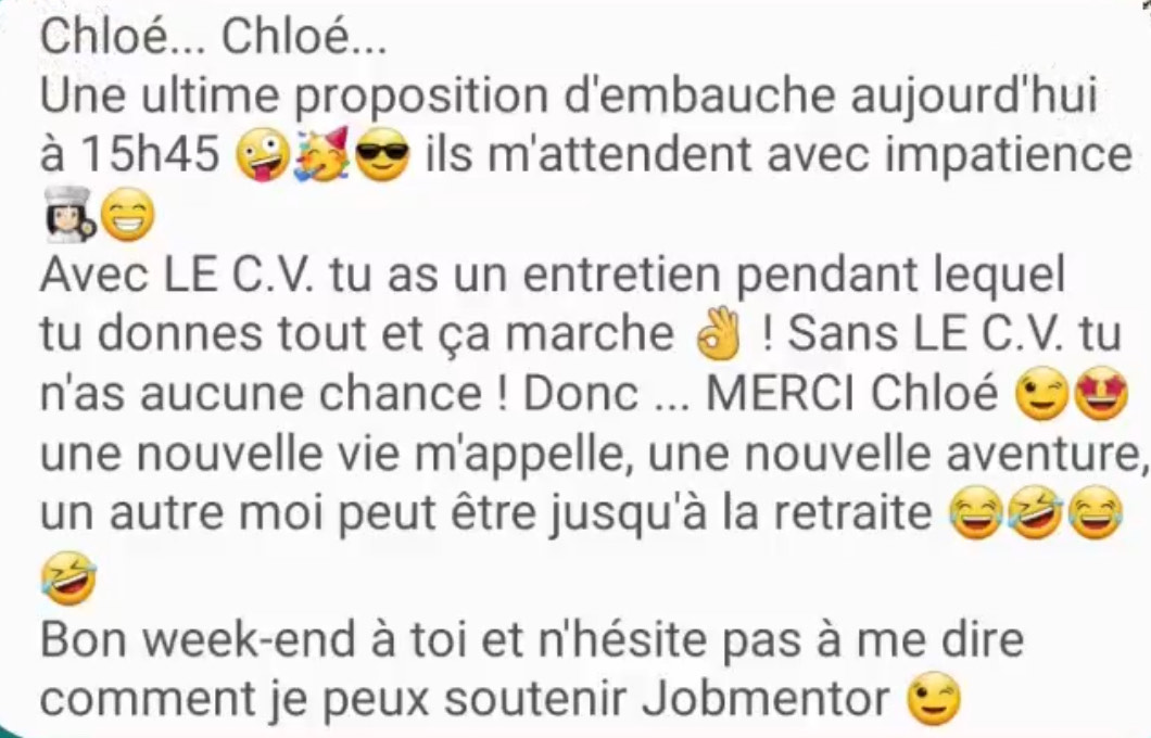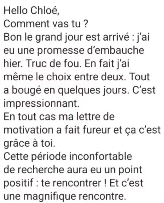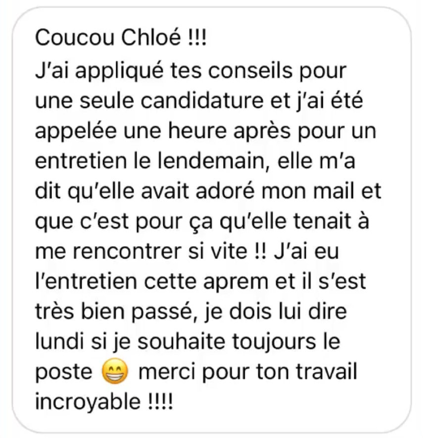 Ou même Maeva qui a fait une candidature remarquable et décroché un entretien après une seule candidature, le lendemain de son envoi
