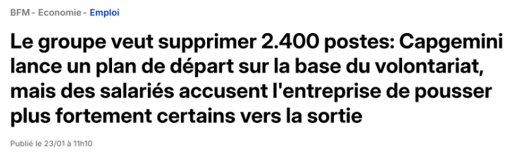 Et dès le lendemain ? Le 23 janvier ? Le groupe Capgemini annonce vouloir supprimer 2400 postes.