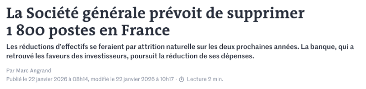 D’ailleurs, 22 janvier 2026, La Société Générale a annoncé vouloir supprimer 1800 postes en France.
